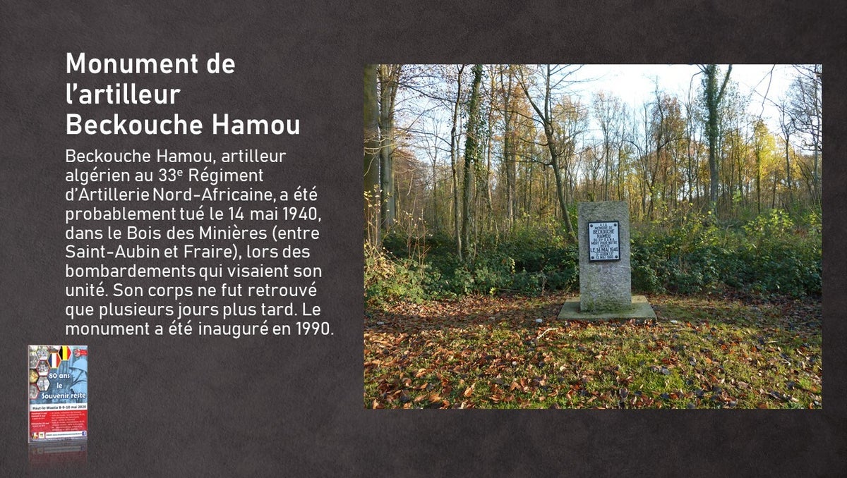 La région comporte un nombre exceptionnellement élévé de lieux commémorant les combats et les victimes de mai 1940. La plupart des fiches que vous pouvez consulter ici ont été réalisées à l'occasion des 80 ans des combats en 2020
